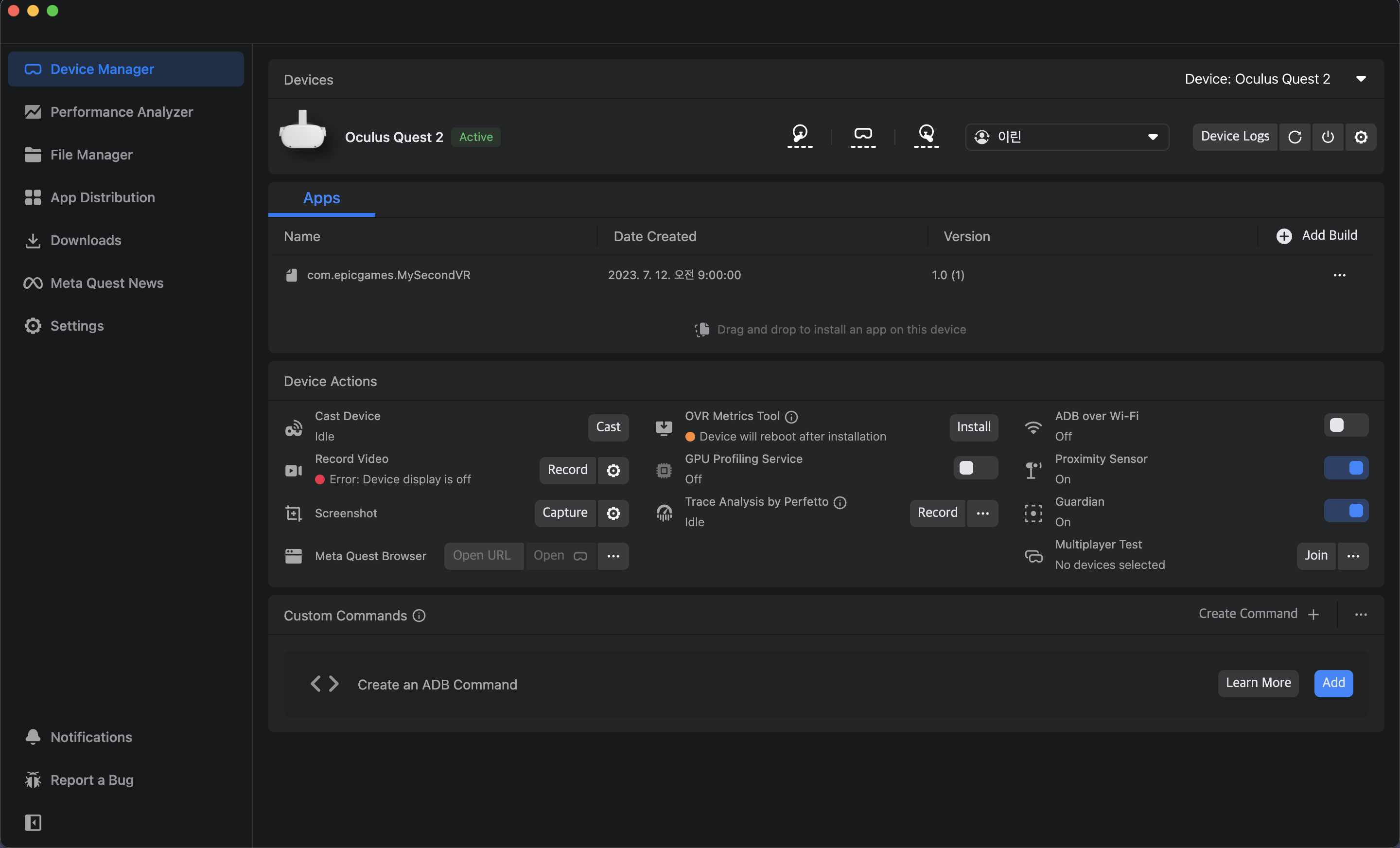 케이블로 맥북과 오큘러스를 연결한 후 Meta Quest Developer Hub를 확인했을 때 다음과 같은 화면이 보여야한다.
